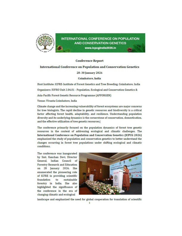 The International Conference on Population and Conservation Genetics (ICPCG 2026), organized by the IUFRO Unit 2.04.01 - Population, Ecological and Conservation Genetics & APFORGEN, was successfully held from 28 to 30 January 2026. The conference drew more than 100 delegates from 11 countries, including India, representing research institutes, academia, State Forest Departments, Paper and Pulp industries, and non-governmental organizations.